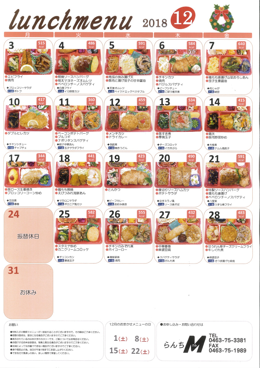 2018年11月27日 / 最終更新日 : 2023年7月27日 maeshouten お弁当のご紹介 2018年12月のLunch menu 2018年12月のLunch menuを公開します! 12月のお任せメニューの日は 1日(土)・8日(土)・15(土)・22日(土) となります! お問合せ らんちM(お弁当・惣菜) TEL.0463-75-3381 らんちM(お弁当・惣菜)