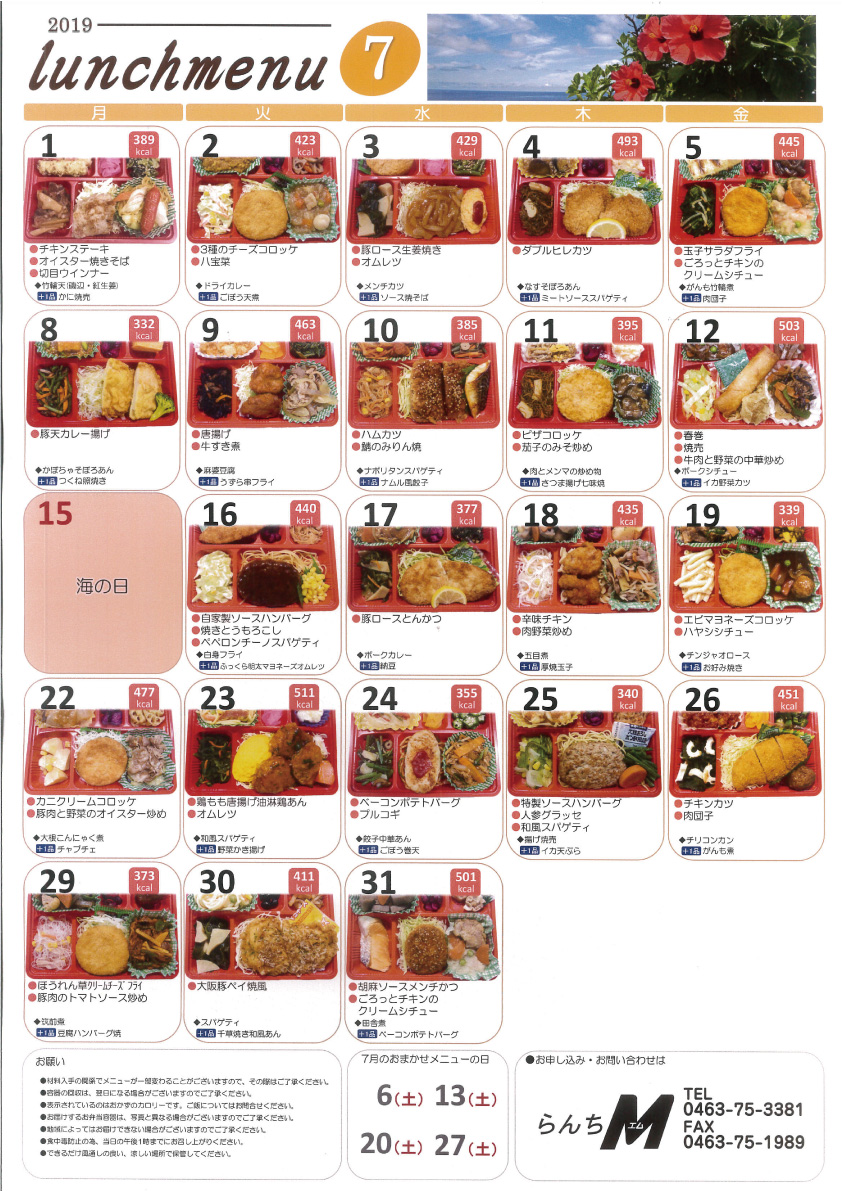 2019年7月12日 / 最終更新日 : 2023年7月27日 maeshouten お弁当のご紹介 2019年7月のLunch menu 2019年7月のLunch menuを公開します! 7月のお任せメニューの日は 6(土)・13日(土)・20日(土)・27日(土) となります! お問合せ らんちM(お弁当・惣菜) TEL.0463-75-3381 らんちM(お弁当・惣菜)