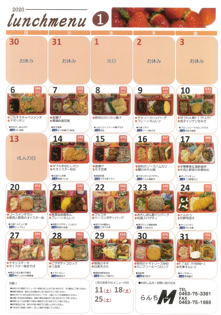 2019年12月9日 / 最終更新日 : 2023年7月27日 maeshouten お弁当のご紹介 2020年1月のLunch menu 2020年1月のLunch menuを公開します! 1月のお任せメニューの日は 11(土)・18日(土)・25日(土) となります! お問合せ らんちM(お弁当・惣菜) TEL.0463-75-3381 らんちM(お弁当・惣菜)