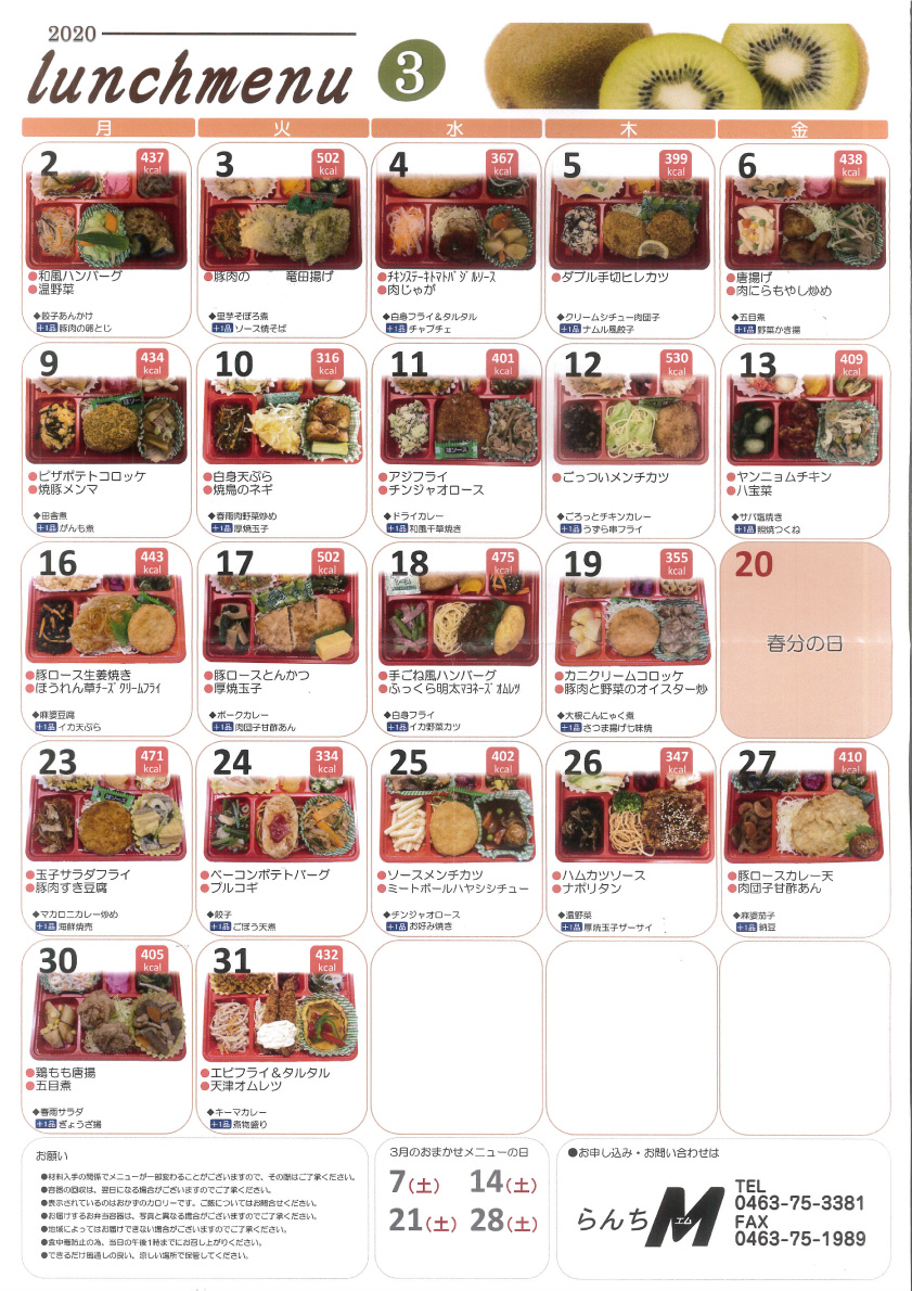 2020年2月17日 / 最終更新日 : 2023年7月27日 maeshouten お弁当のご紹介 2020年3月のLunch menu 2020年3月のLunch menuを公開します! 3月のお任せメニューの日は 7日(土)・14日(土)・21日(土)・28日(土) となります! お問合せ らんちM(お弁当・惣菜) TEL.0463-75-3381 らんちM(お弁当・惣菜)