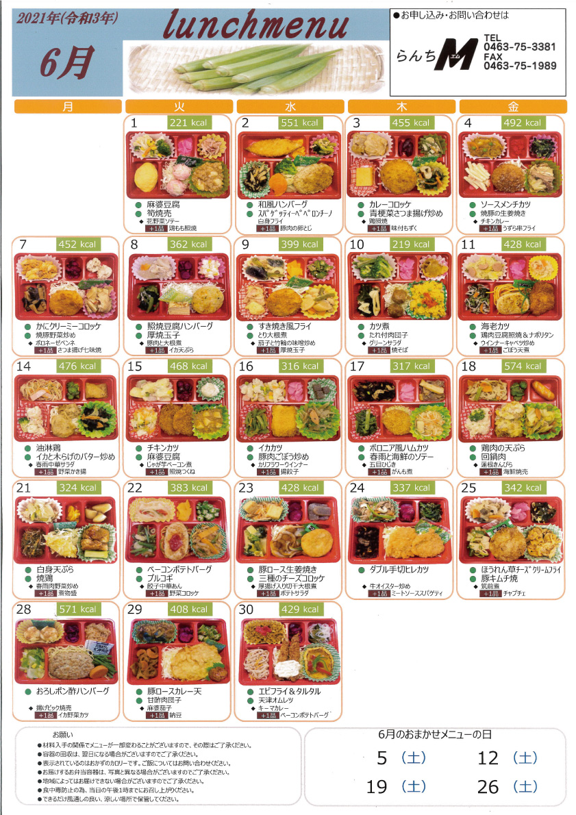 2021年5月21日 / 最終更新日 : 2023年7月27日 maeshouten お弁当のご紹介 2021年6月のLunch menu 2021年5月のLunch menuを公開します! 6月のお任せメニューの日は 5日(土)・12日(土)・19日(土)・26日(土) となります! お問合せ らんちM(お弁当・惣菜) TEL.0463-75-3381 らんちM(お弁当・惣菜)