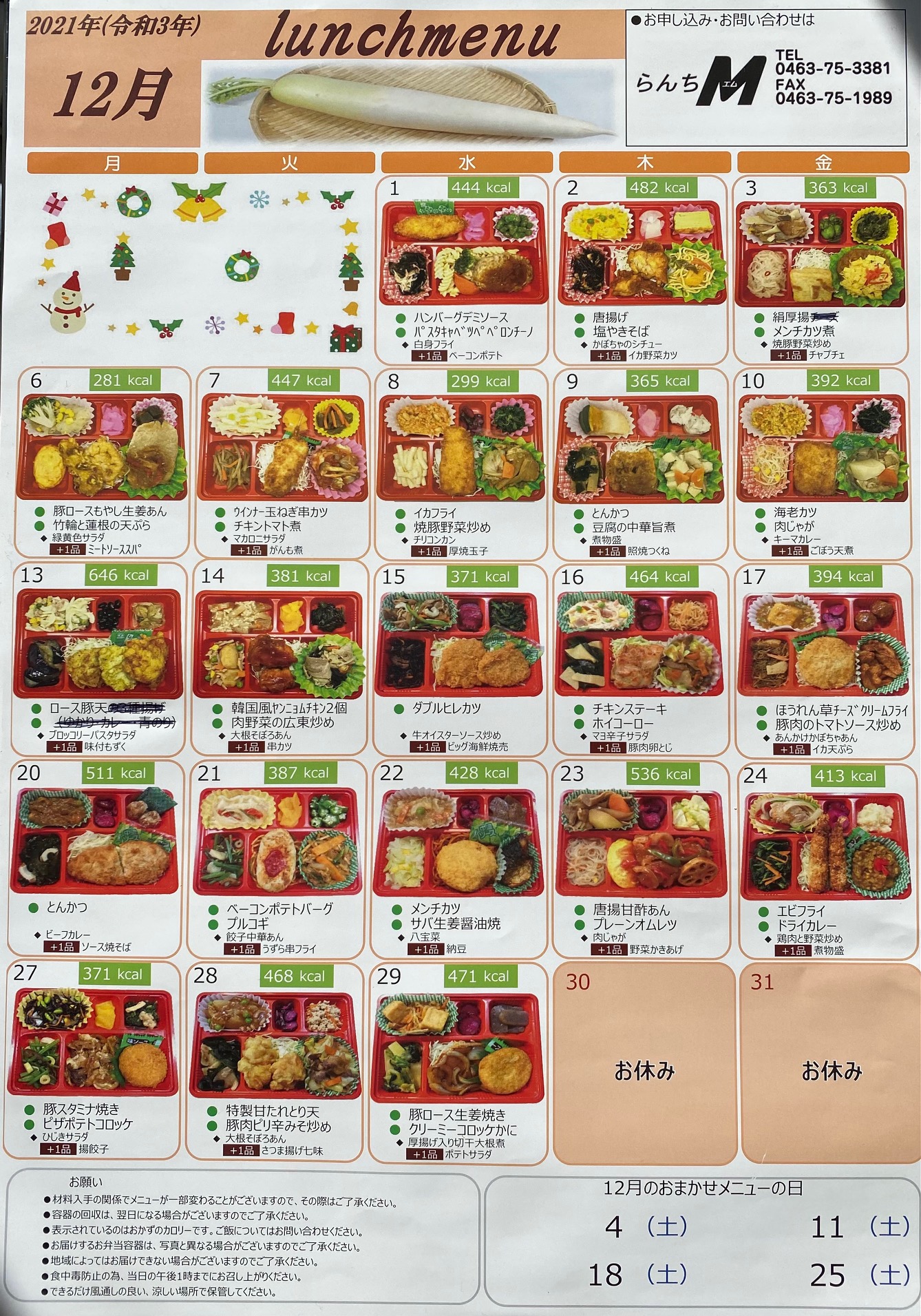 2021年11月29日 / 最終更新日 : 2023年7月27日 maeshouten お弁当のご紹介 2021年12月のLunch menu 2021年12月のLunch menuを公開します! 12月のお任せメニューの日は 4日(土)・11日(土)・18日(土)・25日(土) となります! お問合せ らんちM(お弁当・惣菜) TEL.0463-75-3381 らんちM(お弁当・惣菜)