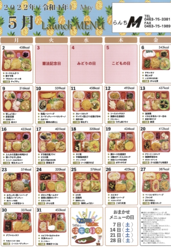 2022年4月25日 / 最終更新日 : 2023年7月27日 maeshouten お弁当のご紹介 2022年5月のLunch menu 2022年5月のLunch menuを公開します! 5月のお任せメニューの日は 7日(土)・14日(土)・21日(土)・28日(土)となります! お問合せ らんちM(お弁当・惣菜) TEL.0463-75-3381 らんちM(お弁当・惣菜)