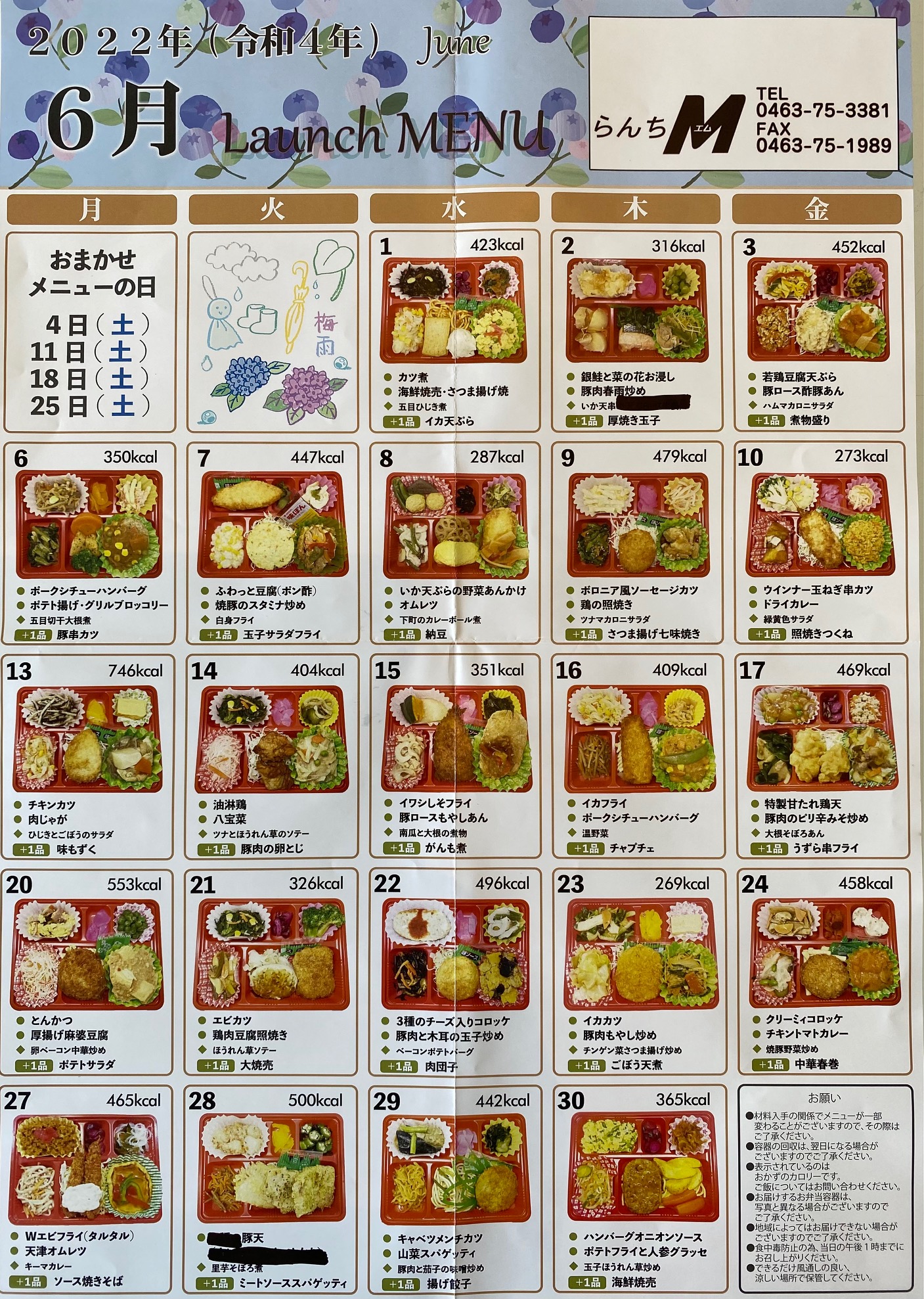 2022年5月30日 / 最終更新日 : 2023年7月27日 maeshouten お弁当のご紹介 2022年6月のLunch menu 2022年6月のLunch menuを公開します! 6月のお任せメニューの日は 4日(土)・11日(土)・18日(土)・25日(土)となります! お問合せ らんちM(お弁当・惣菜) TEL.0463-75-3381 らんちM(お弁当・惣菜)