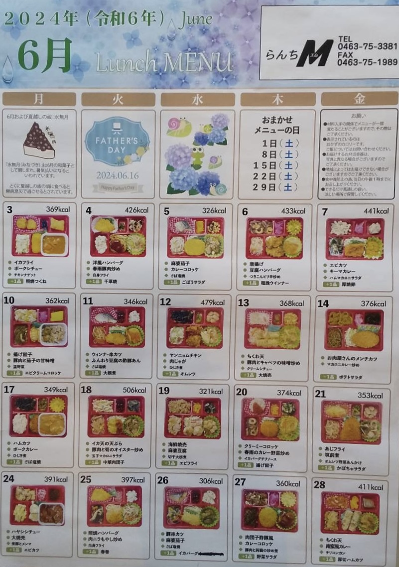 2024年5月22日 / 最終更新日 : 2024年5月22日 maeshouten お弁当のご紹介 2024年6月のLunch menu 2024年6月のLunch menuを公開します! 6月のお任せメニューの日は 1(土)・8日(土)・15日(土)・22日(土)・29日(土)となります! お問合せ らんちM(お弁当・惣菜) TEL.0463-75-3381 らんちM(お弁当・惣菜)