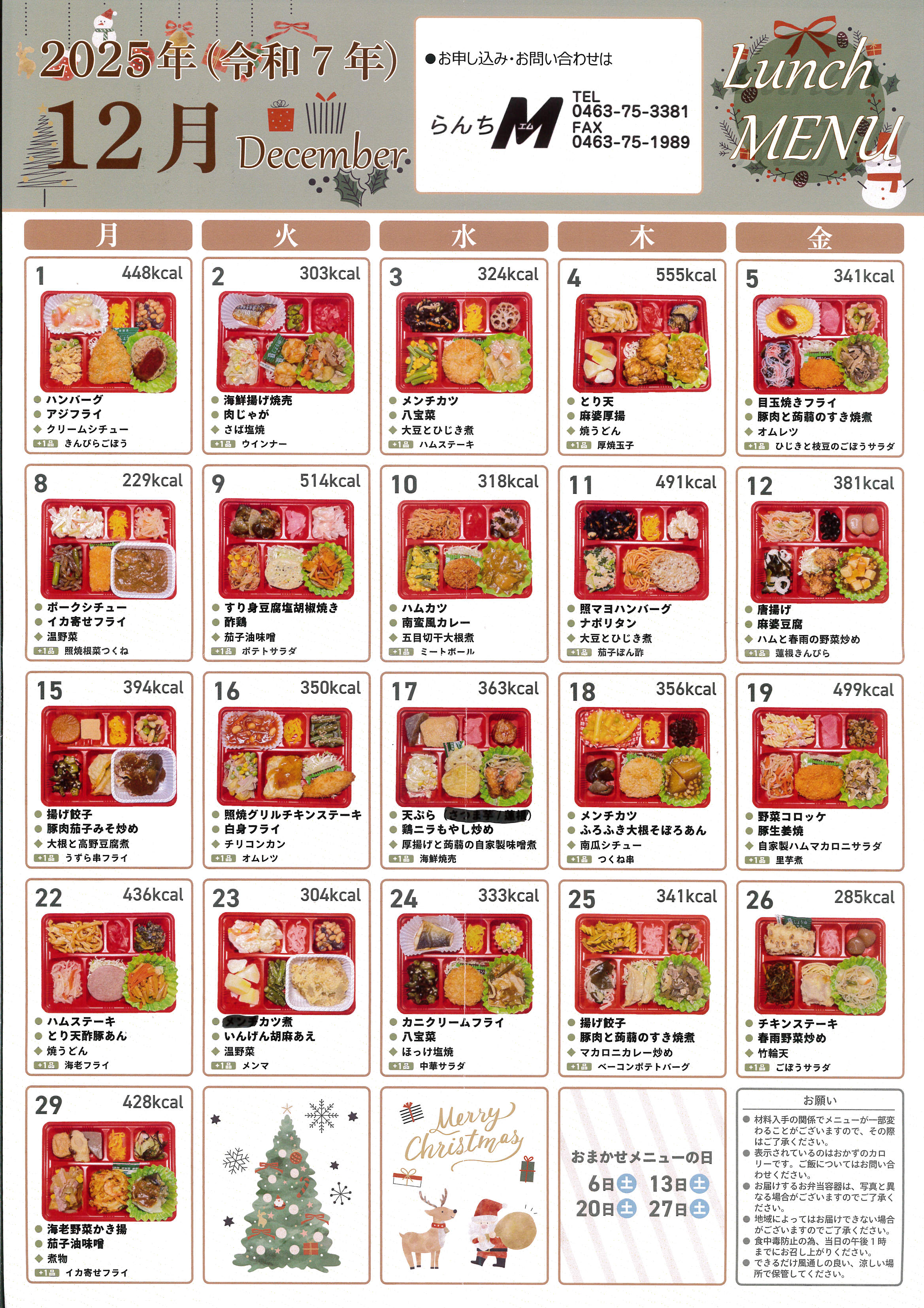 2025年11月12日 / 最終更新日 : 2025年11月12日 maeshouten お弁当のご紹介 2025年12月のLunch menu 2025年12月のLunch menuを公開します! 12月のお任せメニューの日は 6日(土)・13日(土)・20日(土)・27日(土)となります! お問合せ らんちM(お弁当・惣菜) TEL.0463-75-3381 らんちM(お弁当・惣菜)
